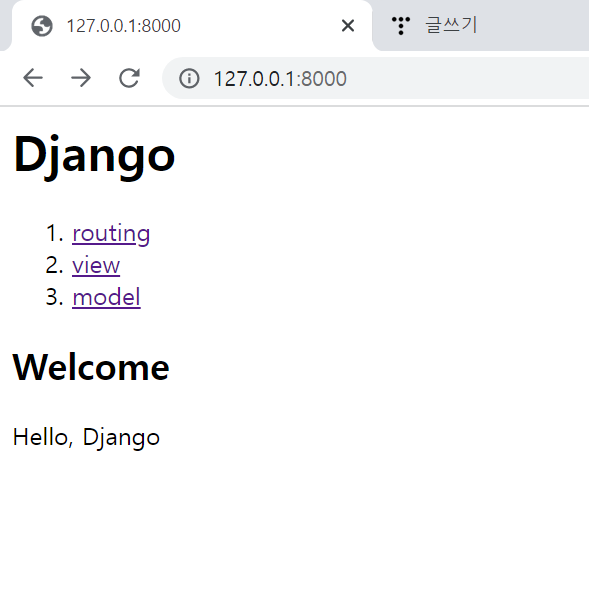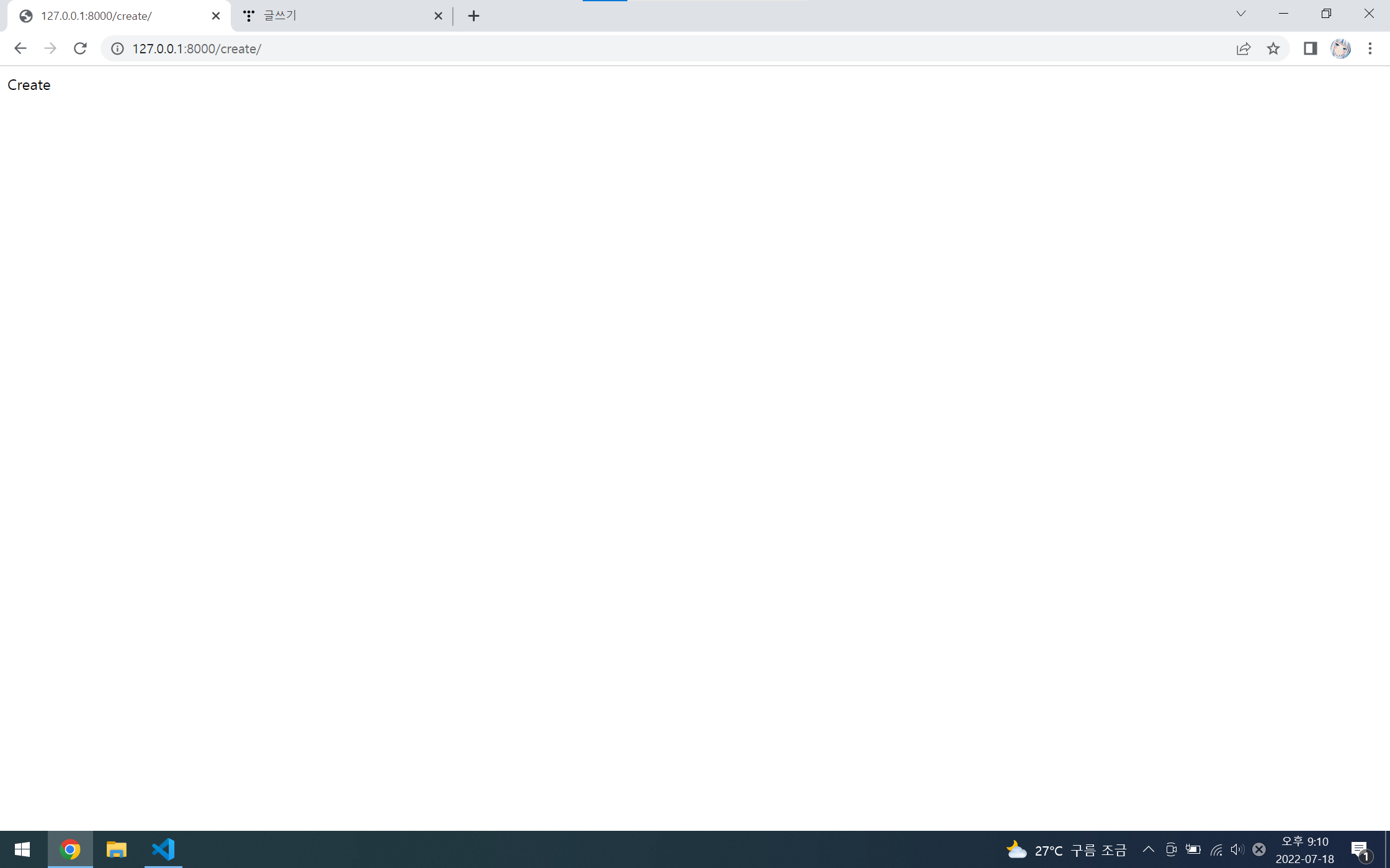 메인 페이지에는 Welcome!, 그리고 /create 를 붙이면 Create가 뜨도록 했다.