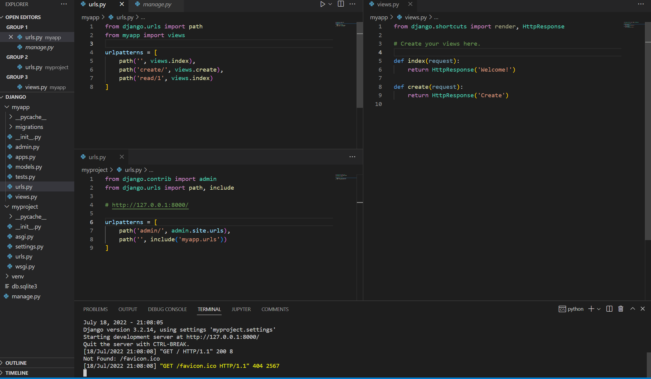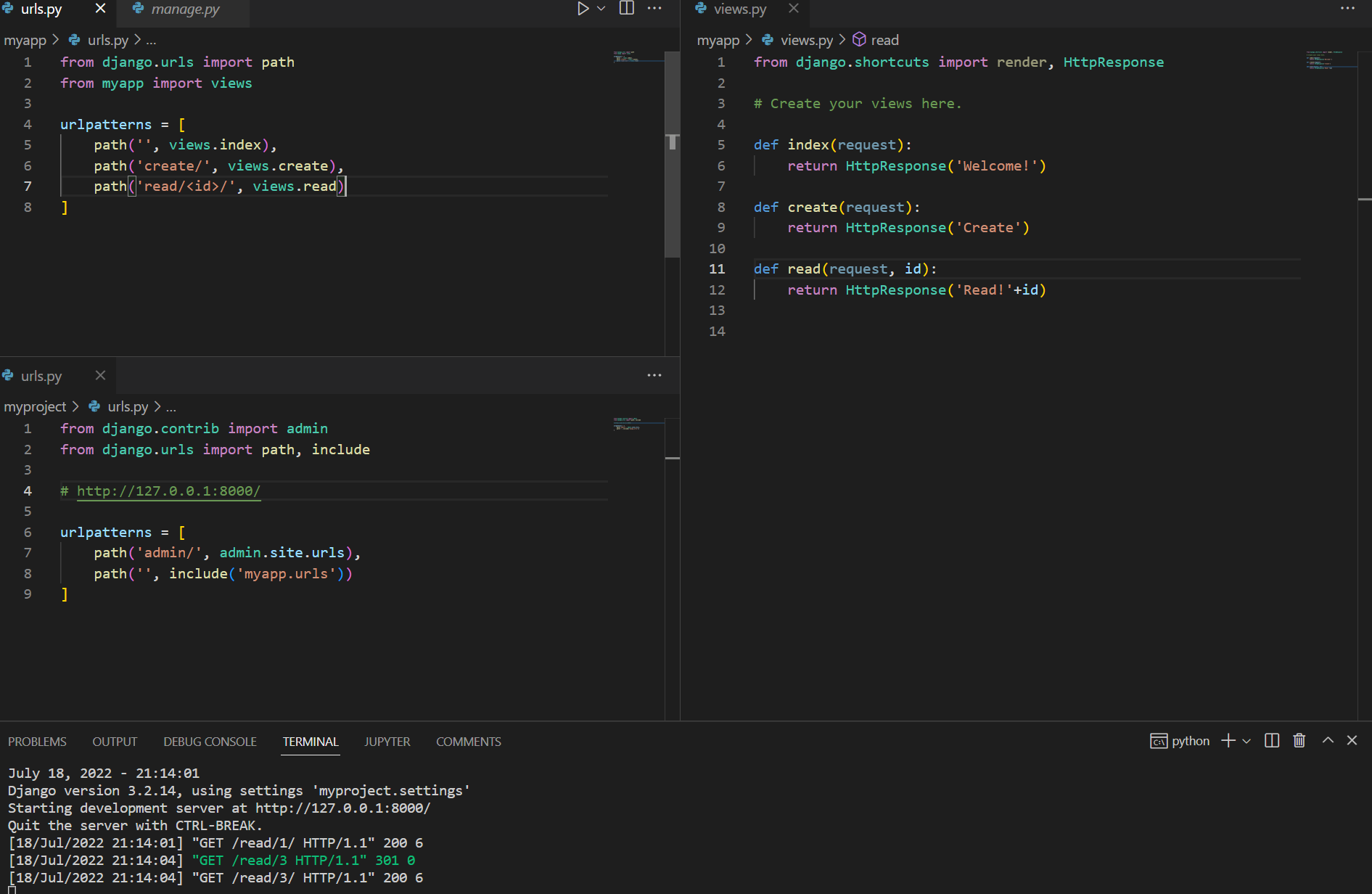 views.py 모듈에서 요청값이 들어오면 HttpResponse를 이용해 http값으로 반환해주는 index, create 함수를 생성.