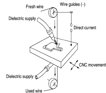 ▷ '와이어 컷 방전가공(WEDM)'이란 방전 가공의 원리를 응용하여 구리, 황동, 텅스텐 와이어를 전극으로 하여 2차원 형태의 윤곽가공을 한다. 일반공작기계로는 가공이 곤란한 미세가공이나 복잡한 형상을 쉽게 가공할 수 있다.
