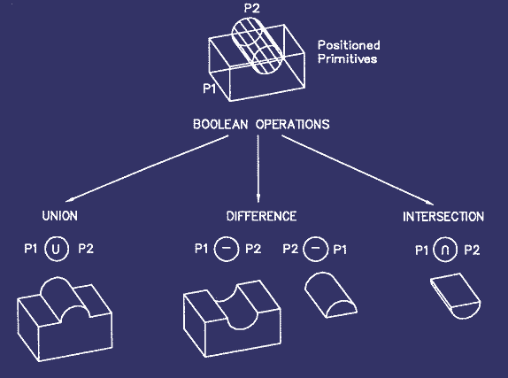 'CSG'란 Constructive Solid Geometry의 약자로, 도형단위요소(Solid Primitive)를 불러와서 조합(합, 차, 적)으로 물체를 표현하는 방식이다. 이 단위요소들을 논리적으로 조합하는 방식을 볼랜 작업(Boolean-operation)이라고 한다. 크게 세 가지, 합집합(union/fusion), 차집합(subtract/difference) 그리고 교집합(intersect/common)으로 이루어진다. 이는 도형을 불러와서 내부까지 연산차리하므로, 물체의 내부 정보(중량, 체적, 무게중심 등)을 구하기가 용이하다.