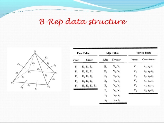 'B-Rep'이란 Boundary Representation의 약자로 직역하자면 경계표현이다. 즉, 입체(Solid)를 둘러싸고 있는 면의 조합으로 표현하는 방식이다. 자세히 말하자면, 물체의 점(vertex), 모서리(face), 면(face)의 상관관계를 이용해서 물체를 형상화한다. 따라서, 입체 내의 모든 점과 면과 모서리의 상관관계를 설정해야 하므로 많은 메모리를 차지한다는 특징이 있다.