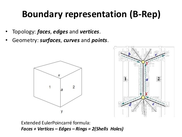 또한, B-Rep 방식을 묻는 경우 '오일러-푸앵카레(포앙카레) 공식'을 묻을 때가 빈번하므로 알아두는 것이 좋다. 한 차원씩 올라갈수록 빼고 더하는것을 교차하며 외운다고 생각하면 편하다. 기호를 점(v), 선(e), 면(f), 입체(s), 초입방체(h)로 두는 경우가 많다.