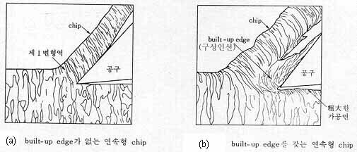 장점: 안정된 구성인선은 공구에 달라붙어 공구의 수명을 연장시키고 칩과의 접촉길이를 짧게하여 마찰력을 감소시킨다.