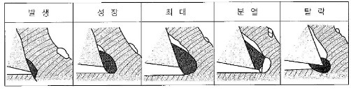 발생 ---> 성장 ---> (최대) ---> 분열 ---> 탈락 (1/10~1/1200s 주기)