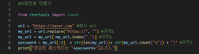 password = my_url[:3] + str(len(my_url))+ str(my_url.count("e")) + "!" #규칙3