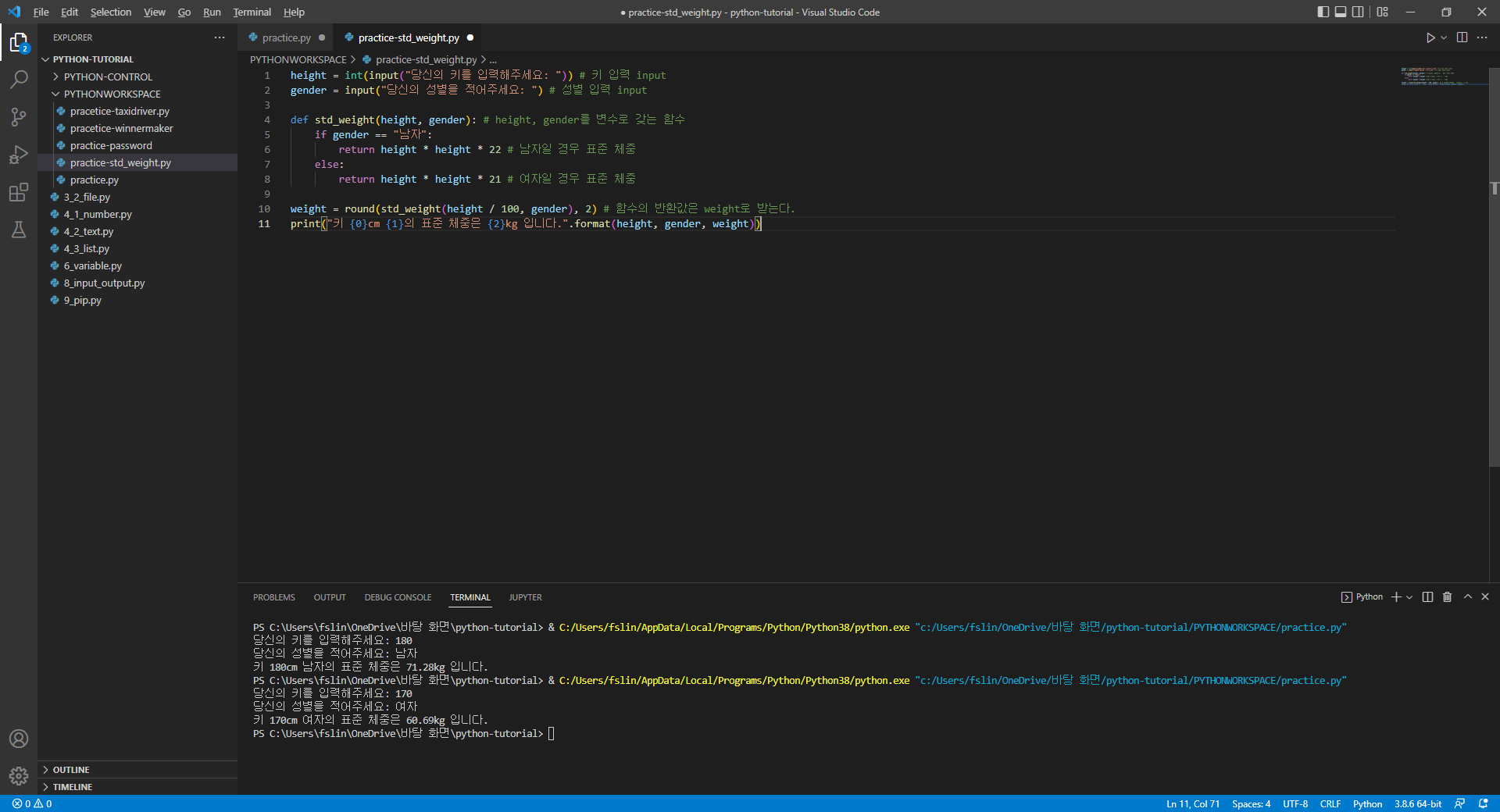 이를 std_weight 함수에 대입. 반환값으로 weight로 출력.