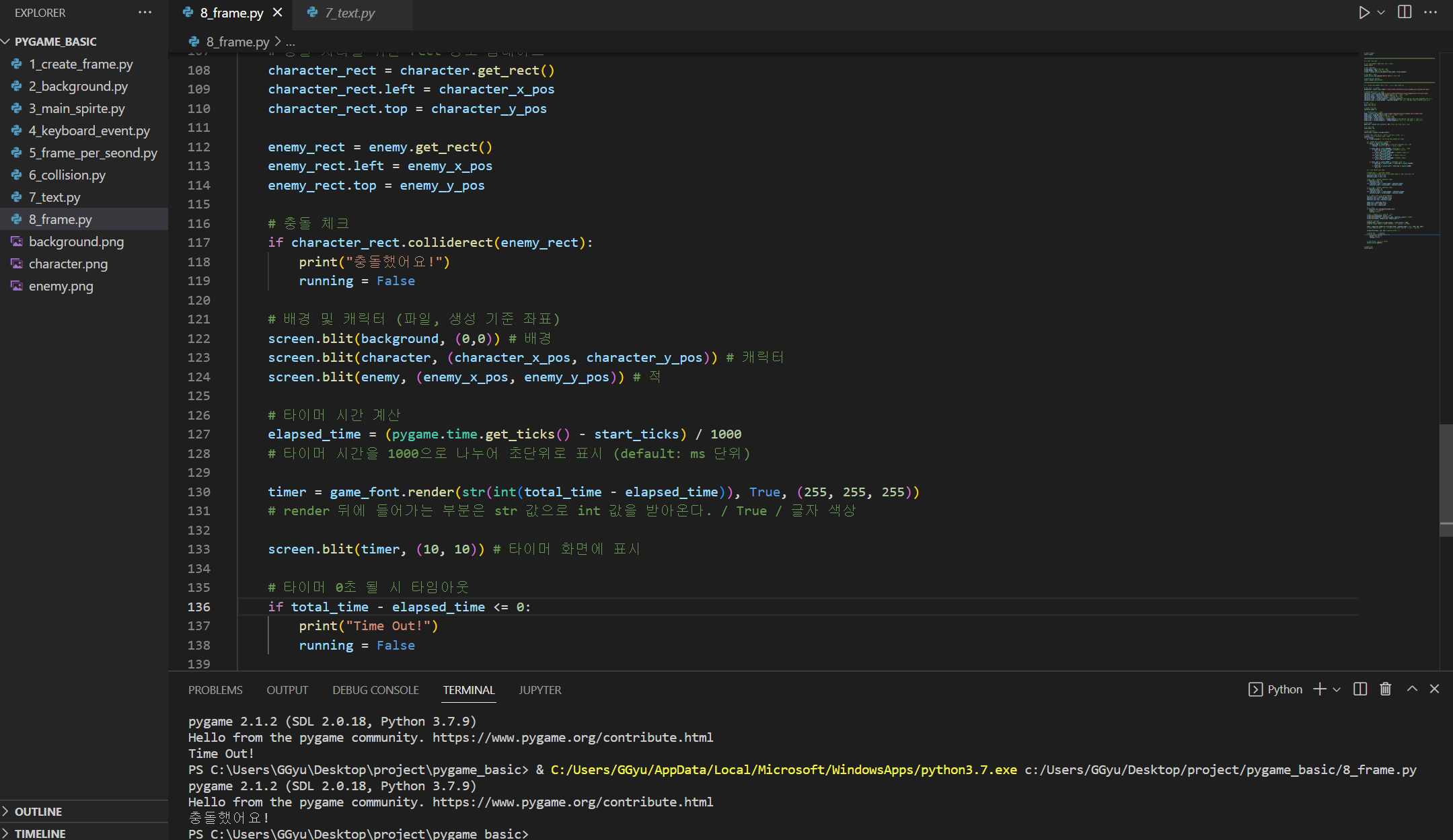타이머를 표시해주기 위해 timer 변수를 지정해줬는데, python은 기본 출력단위가 ms단위라 보기 편하게 1000을 나눠줌으로서 초단위로 바꿔주었다. 그리고 이를 int값으로 받으면서 정수만 표출되게 하고, 또 이를 str로 받으며 render 함수의 변수로 쓰일 수 있게 하였다. 할 때는 몰랐는데 쓰다보니 복잡해지네.. 이후 타이머가 0이 될 시에 게임 종료 기능을 만들었다.