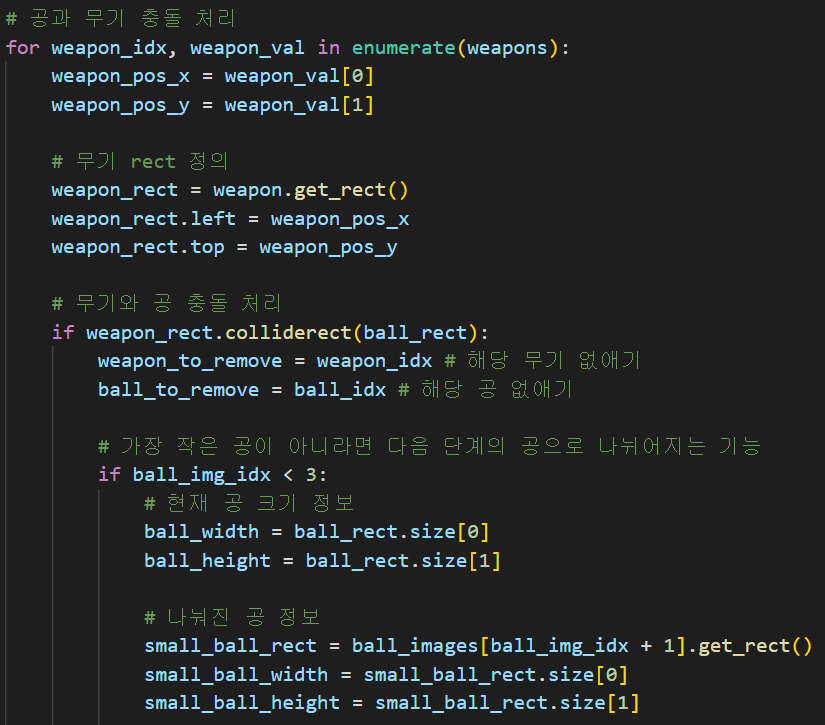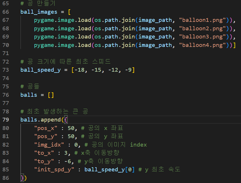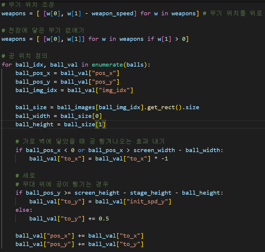 공 위치를 for 구문을 통해 ball_idx, ball_val 값을 enumerate(balls) 으로 지정해줍니다. 이러면 ball_idx에는 balls의 인덱스가, ball_val 에는 balls의 밸류값이 차례대로 쌍으로 들어갑니다. 그리고 이렇게 들어간 값들을 ball의 x, y 그리고 이미지 순서마다 밸류값을 지정해줍니다.