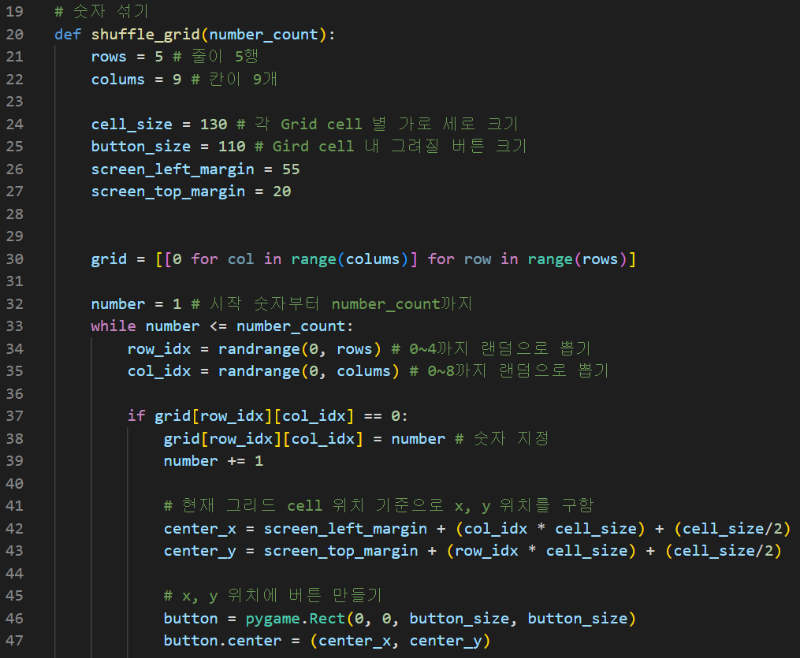 이 게임의 핵심이라 볼 수 있는 코드다. 숫자 및 박스가 뜰 공간을 정의해주기 위해, gird 를 생성한다. 생성할 gird는 rows(행)이 5, colums(열) 9인 총 45칸의 테이블이라 말할 수 있다.