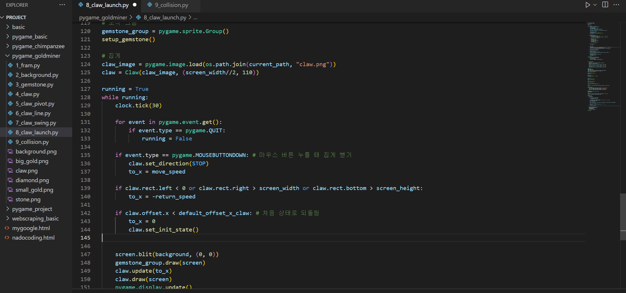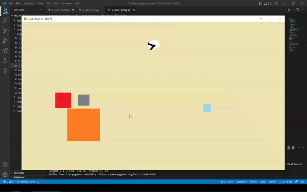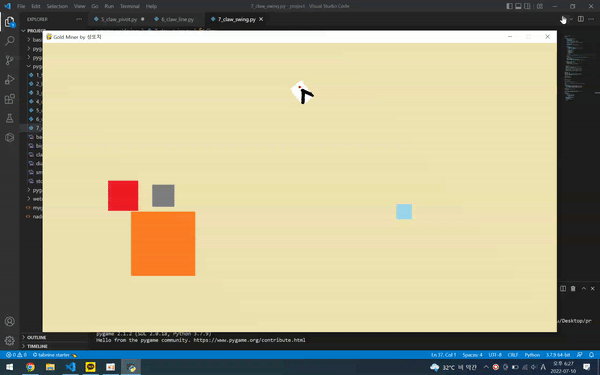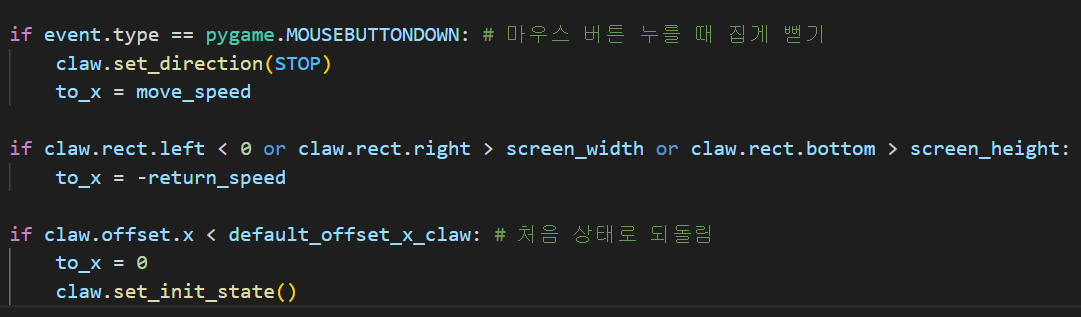 claw의 범위가 화면 바깥으로 나갈 때, to_x(집게가뻗어나가는속도)에 -값을 할당해서 다시 돌아오게 만들었어.
