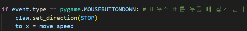 pygame.MOUSEBUTTONDOWN 함수를 이용해 마우스를 누를 때를 조건으로 하여,
