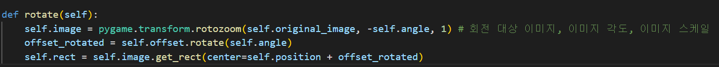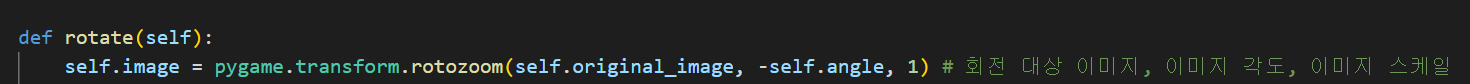 그리고 rotate란 함수를 만들어, transform.rotozoom 을 통해 객체를 계속 따라다니며 회전하게 만들었어.