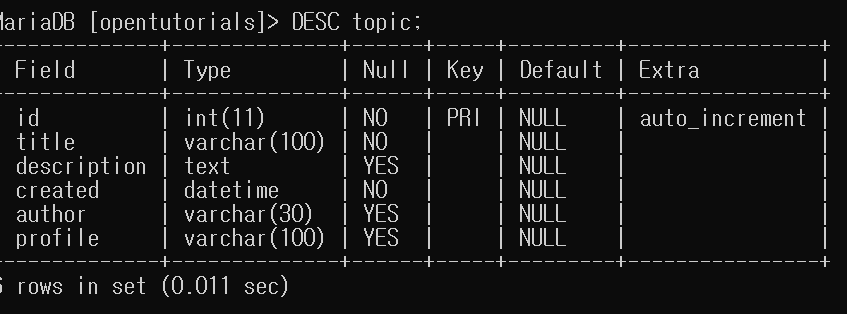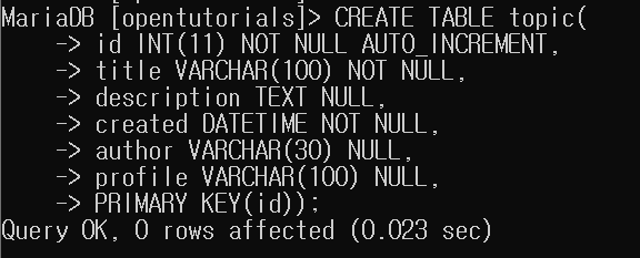 MariaDB [opentutorials]> CREATE TABLE topic(