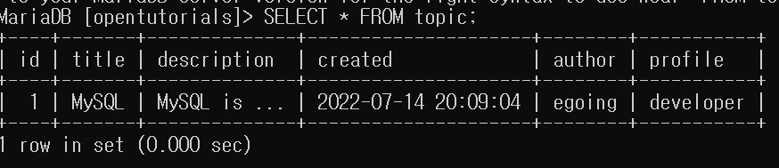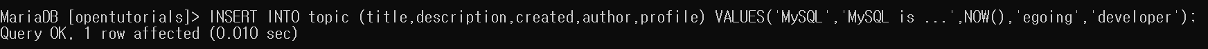 MariaDB [opentutorials]> INSERT INTO topic (title,description,created,author,profile) VALUES('MySQL','MySQL is ...',NOW(),'egoing','developer');