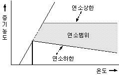 4. 연소범위(=연소한계, 폭발범위, 폭발한계) : 연소에 필요한 가연성 기체와 또는 산소와의 혼합기체의 농도 범위.