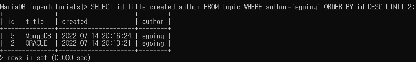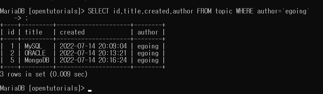 author의 데이터가 egoing 인 것만을 가져와보기.