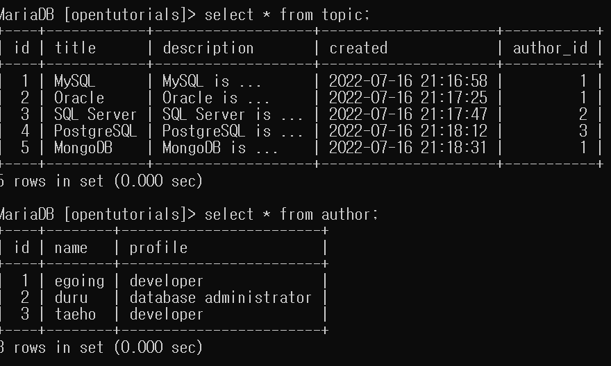 topic 테이블과 author 테이블을 생성했다.