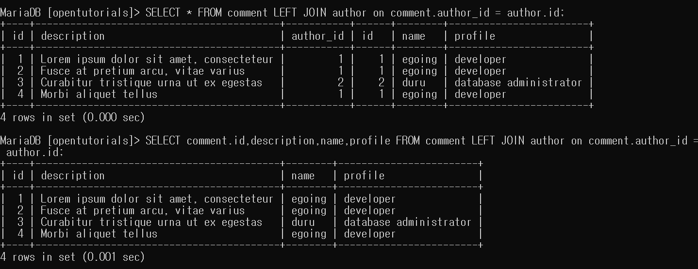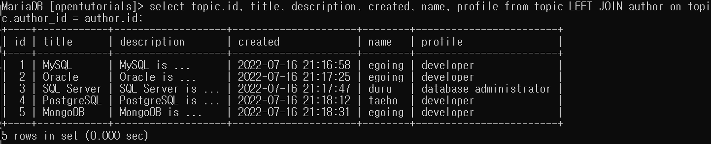 select * from topic LEFT JOIN author ON topic.author_id = author.id; 를 통해